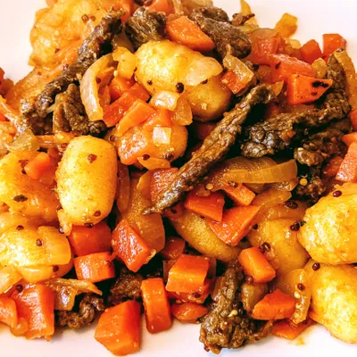 Gnocchi mit Rindfleisch-Streifen in einer Senf-Zwiebel-Soße.