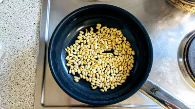 1.Pinienkerne leicht anbraten, abkühlen lassen und in den Mixer geben.