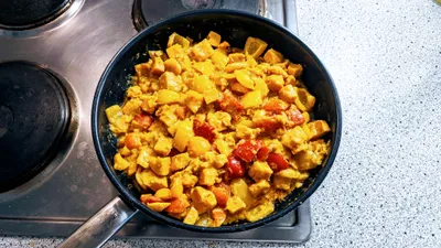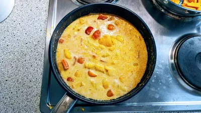 5.Wenn die Kartoffel fast durch sind, die Mischung hinzugeben, und mit geschlossenem Deckel solange kochen, bis die Kartoffeln weich sind.