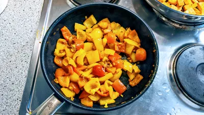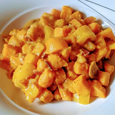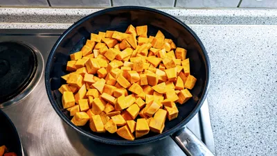3.Die Süßkartoffel in mundgerechte Würfel schneiden und in einer anderen Pfanne anbraten.