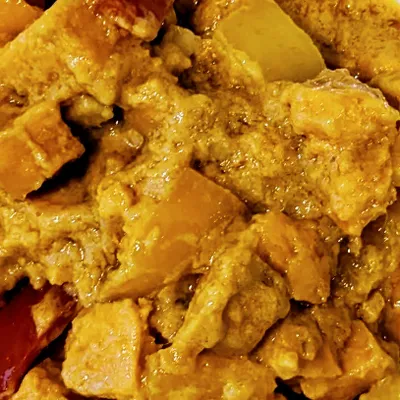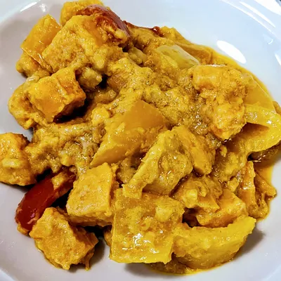 4.Wenn das Gemüse weit genug gebraten ist, das Curry hinzugeben, vermischen und etwas anbraten. Kokosmilch hinzugeben und aufkochen.